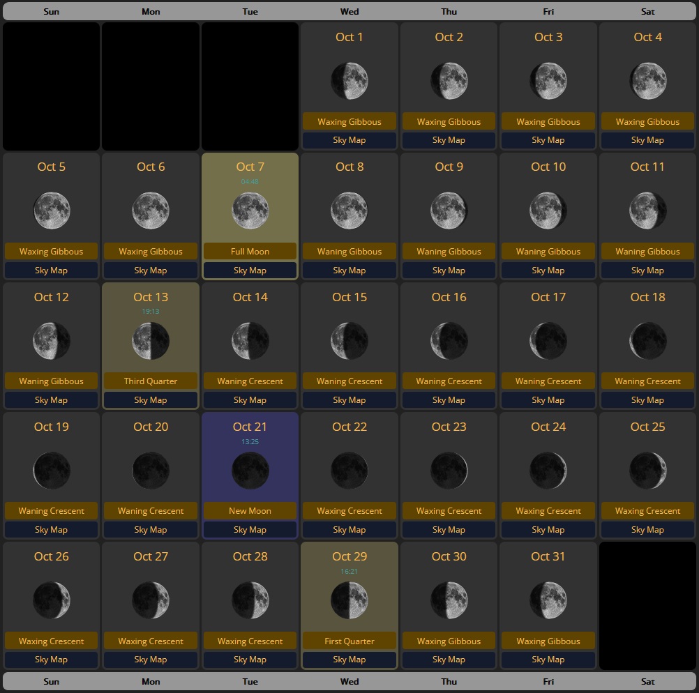 Calendario lunar del mes de octubre de 2025. (Fuente: theskylive.com).