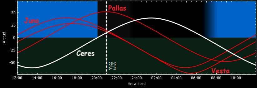 Gráfica de altura vs tiempo para objetos en Cinturón de Asteroides para el día 15 de octubre de 2025. Fuente: Software Kstars https://edu.kde.org/kstars/