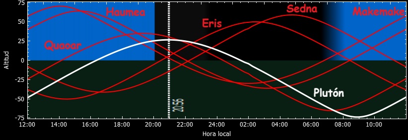 Gráfica de altura vs tiempo para objetos en Cinturón de Kuiper para el día 15 de octubre de 2025. Fuente: Software Kstars https://edu.kde.org/kstars/