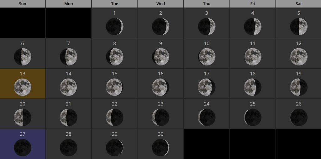 Luna: Comienza el mes en el día 1 en fase creciente al 9.1% en conjunción con M45 (Pleyades), el día 5 en cuarto creciente a las 04:14 horas y en conjunción con Marte, el día 6 en conjunción con M44, el día 12 en conjunción con Spica, el día 13 llena a las 02:22 horas, el día 14 a 00:48 horas en apogeo, la madrugada del día 17 en conjunción con Antares, el día 21 en cuarto menguante a las 03:35 horas, la madrugada del día 25 en conjunción con Venus, el día 27 a las 18:18 horas en perigeo y luna nueva a las 21:31 horas el mismo día.