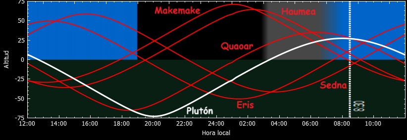 Gráfica de altura vs tiempo para objetos en Cinturón de Kuiper para el día 15 de abril de 2025. Fuente: Software Kstars https://edu.kde.org/kstars/
