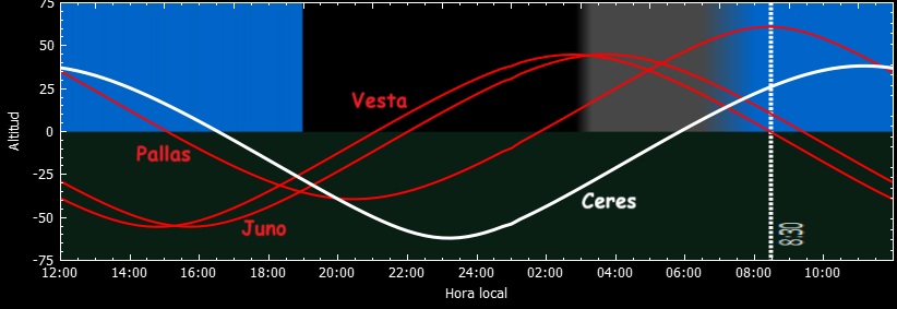 Gráfica de altura vs tiempo para objetos en Cinturón de Asteroides para el día 15 de abril de 2025. Fuente: Software Kstars https://edu.kde.org/kstars/