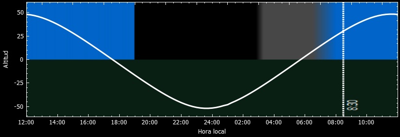 Gráfica de altura vs tiempo para planeta Marte para el día 15 de abril de 2025. Fuente: Software Kstars https://edu.kde.org/kstars/