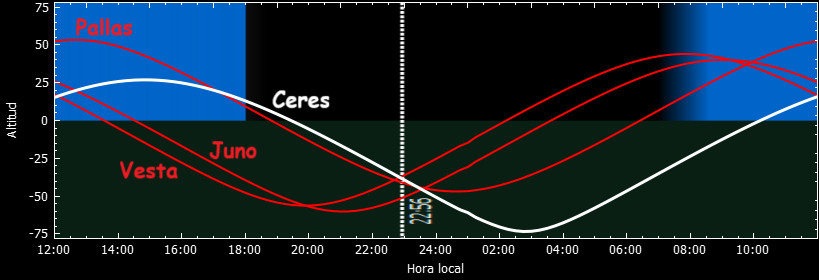Gráfica de altura vs tiempo para objetos en Cinturón de Asteroides para el día 15 de enero de 2025. Fuente: Software Kstars https://edu.kde.org/kstars/