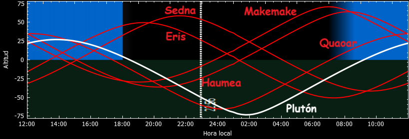 Gráfica de altura vs tiempo para objetos en Cinturón de Kuiper para el día 15 de enero de 2025. Fuente: Software Kstars https://edu.kde.org/kstars/
